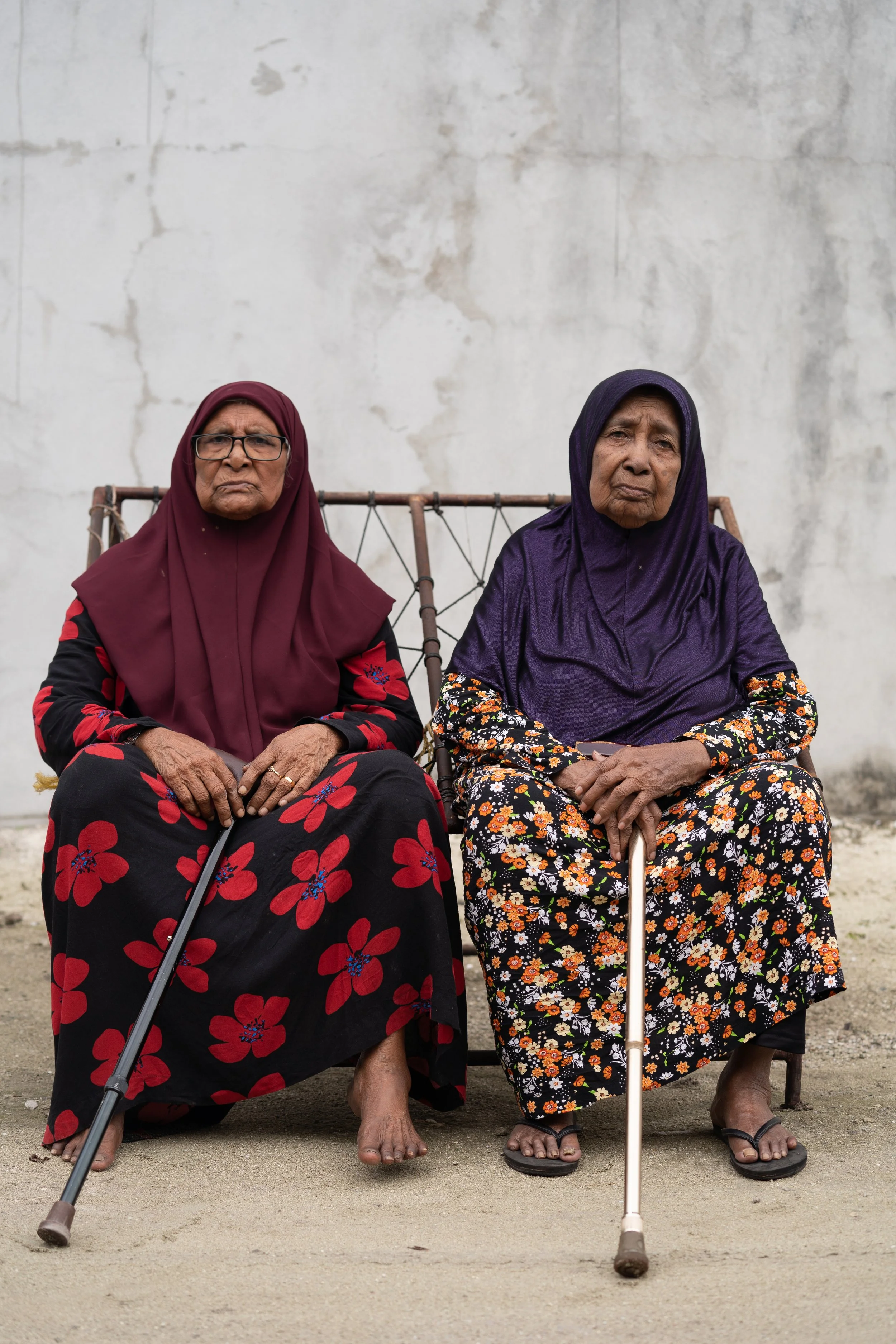 Two elderly women sitting on a bench, each holding a cane, against a worn gray concrete wall.