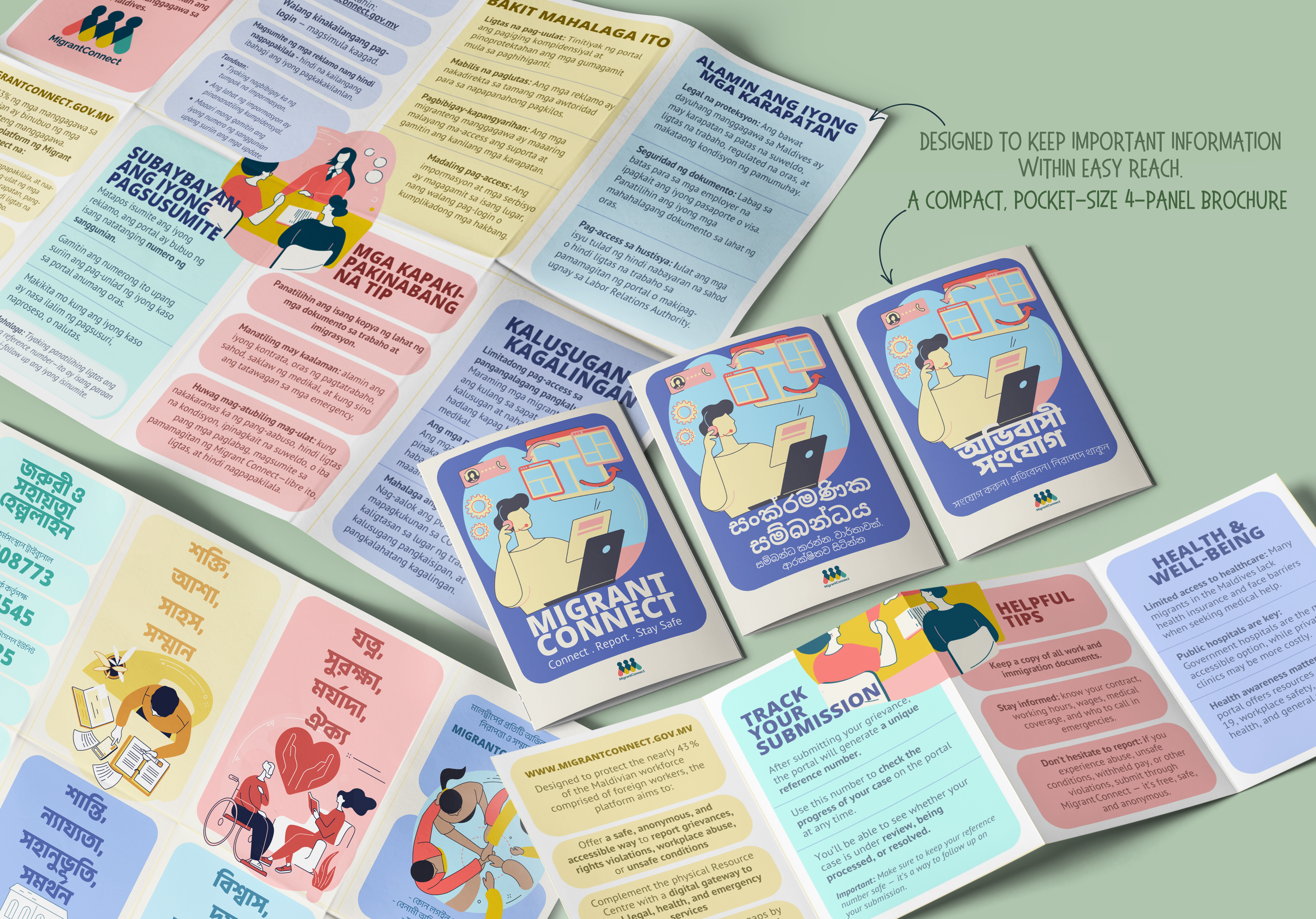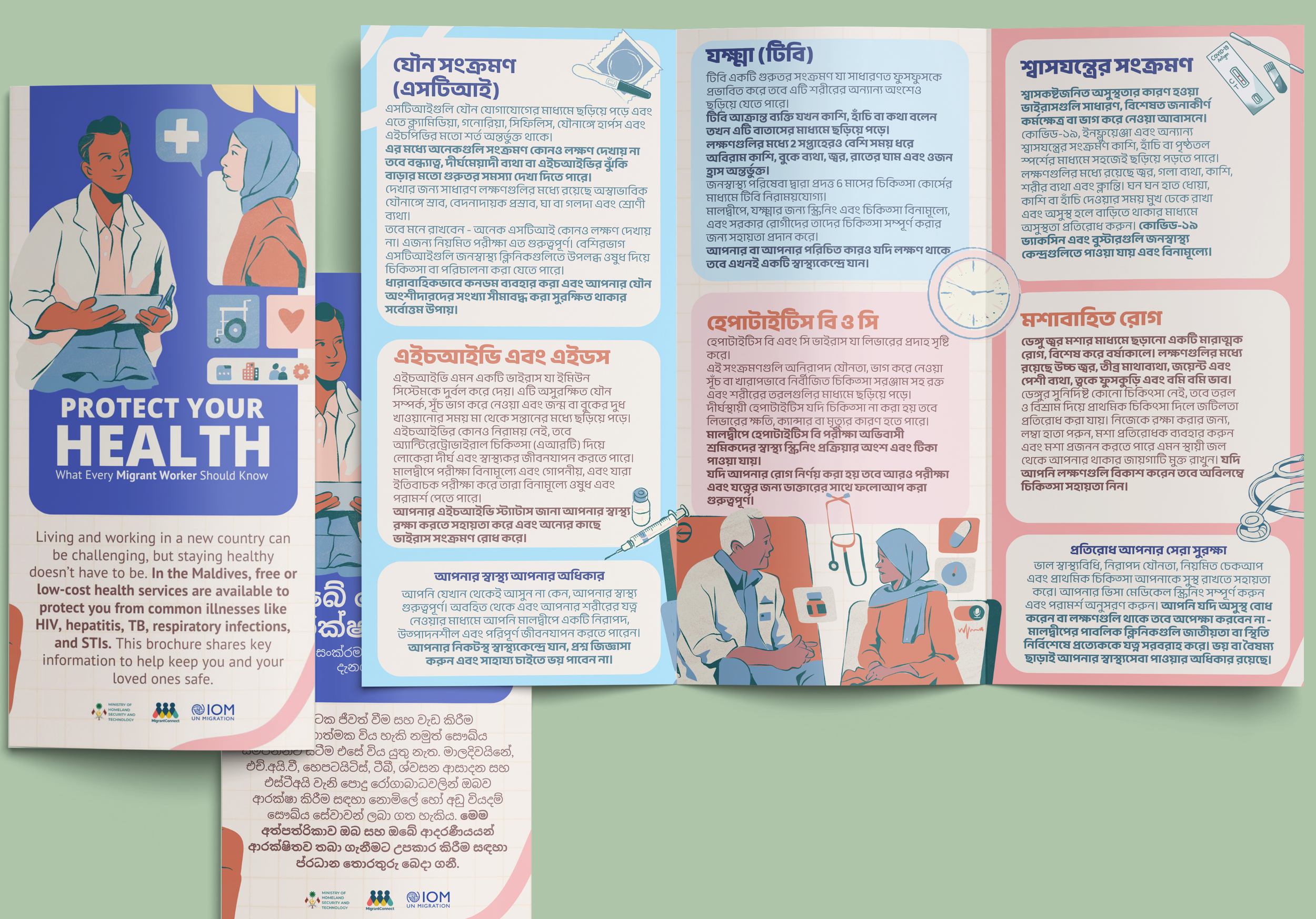 We created multilingual information cards containing essential health and emergency details for migrant workers in the Maldives. Designed to be small, portable, and easy to keep, the cards provided quick access to helpline numbers and guidance on key services. Printed and distributed in locations frequently visited by migrant workers, the cards offered an accessible and practical tool to help improve awareness and safety across diverse migrant communities.